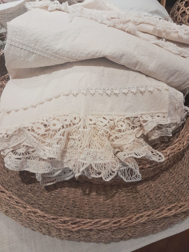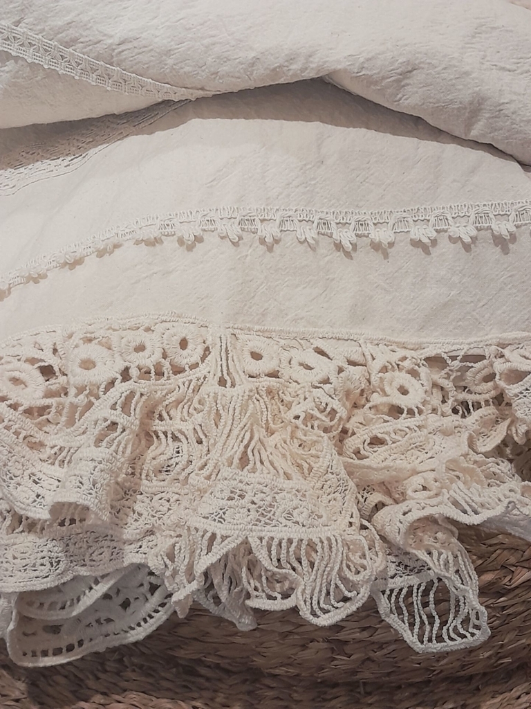 Transforma tu dormitorio en un refugio de elegancia con nuestro set de pie de cama. Realizado en tussor de algodón con delicadas puntillas importadas y un hermoso acabado artesanal, este pie de cama de 240 cm de largo presenta encantadores detalles en volados y pasamanería.